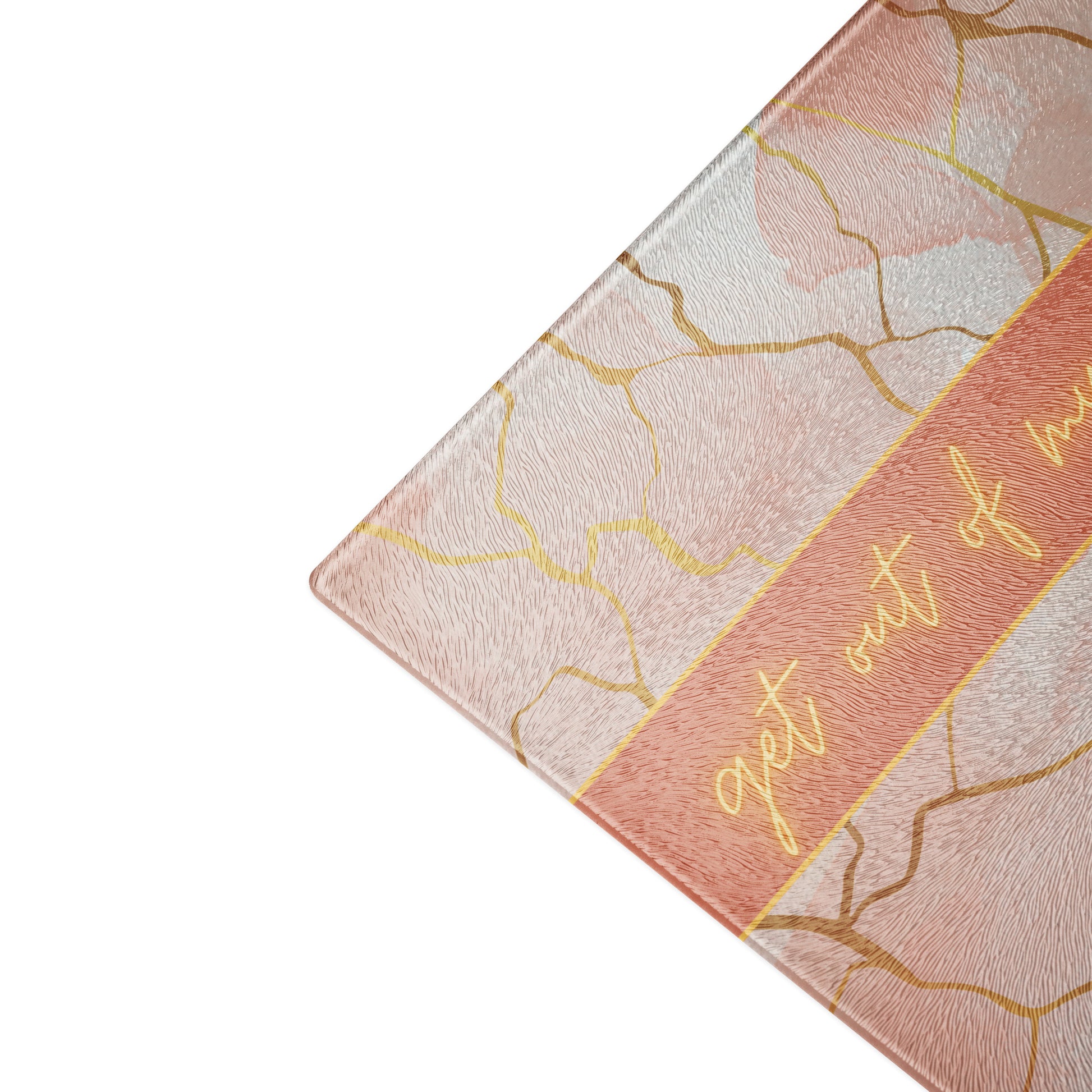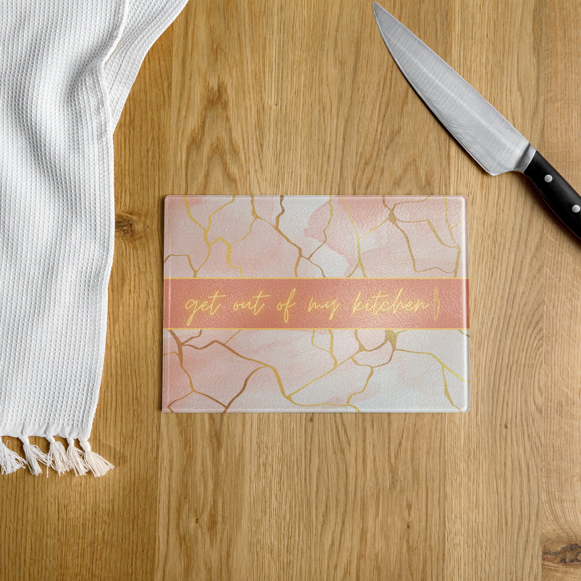 Pink & Gold Glass Cutting Board – “Get Out of My Kitchen” Funny Kitchen Décor Gift